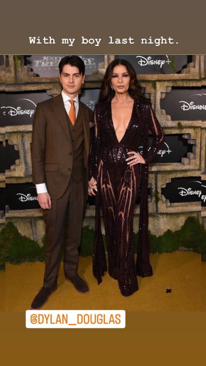 El primogénito de la actriz, y también hijo de Michael Douglas (78), acompañó a su madre en este evento tan importante y para ello eligió un traje de tres piezas (pantalón, saco y chaleco) en color café, mientras que Catherine optó por un vestido largo de lentejuelas con transparencias y con pronunciado escote en V, dejando su largo cabello suelto.