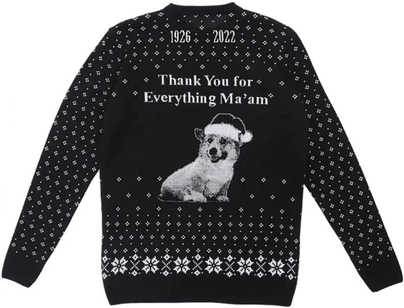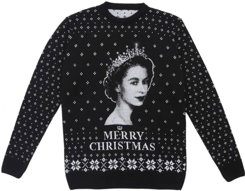 Se trata de la línea de Navidad 2022 de la marca que incluye un estilo conmemorativo de la Reina Isabel II, con el cual pretenden honrar la memoria de la difunta monarca. La prenda esta diseñada en color negro con algunos detalles en blanco que muestra el rostro de una joven Isabel con su tiara y contiene la frase “Feliz Navidad”.