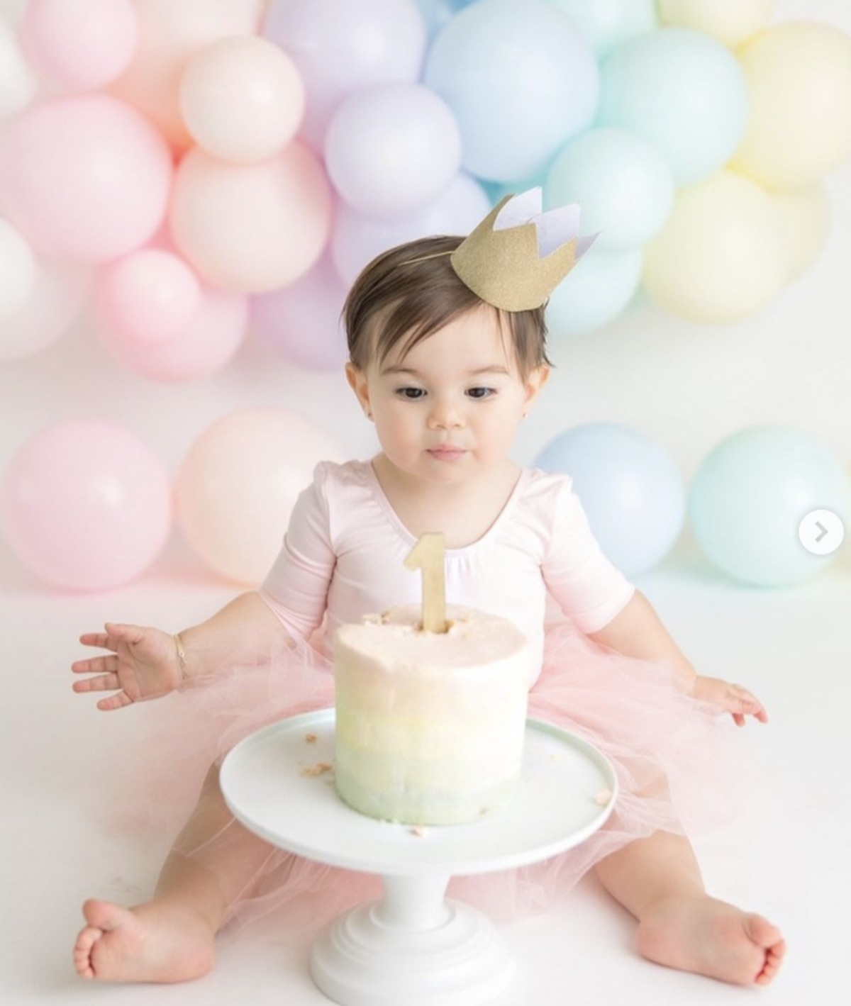 Ximena Navarrete y su esposo decidieron hacer una tierna sesión fotográfica en donde la pequeña posó con una tierna coronita y un tutú con un bizcocho con el número 1 y globos en colores pastel de fondo.