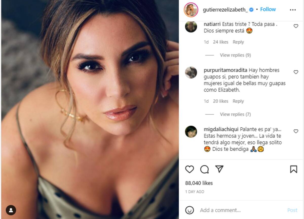 Pero como en casi en toda ruptura, hay un proceso de duelo, y es precisamente el que está dejando ver la actriz Elizabeth Gutiérrez, quien recientemente publicó en su perfil de Instagram una fotografía de ella con un mensaje que proyecta su optimismo ante la situación por la que atraviesa.