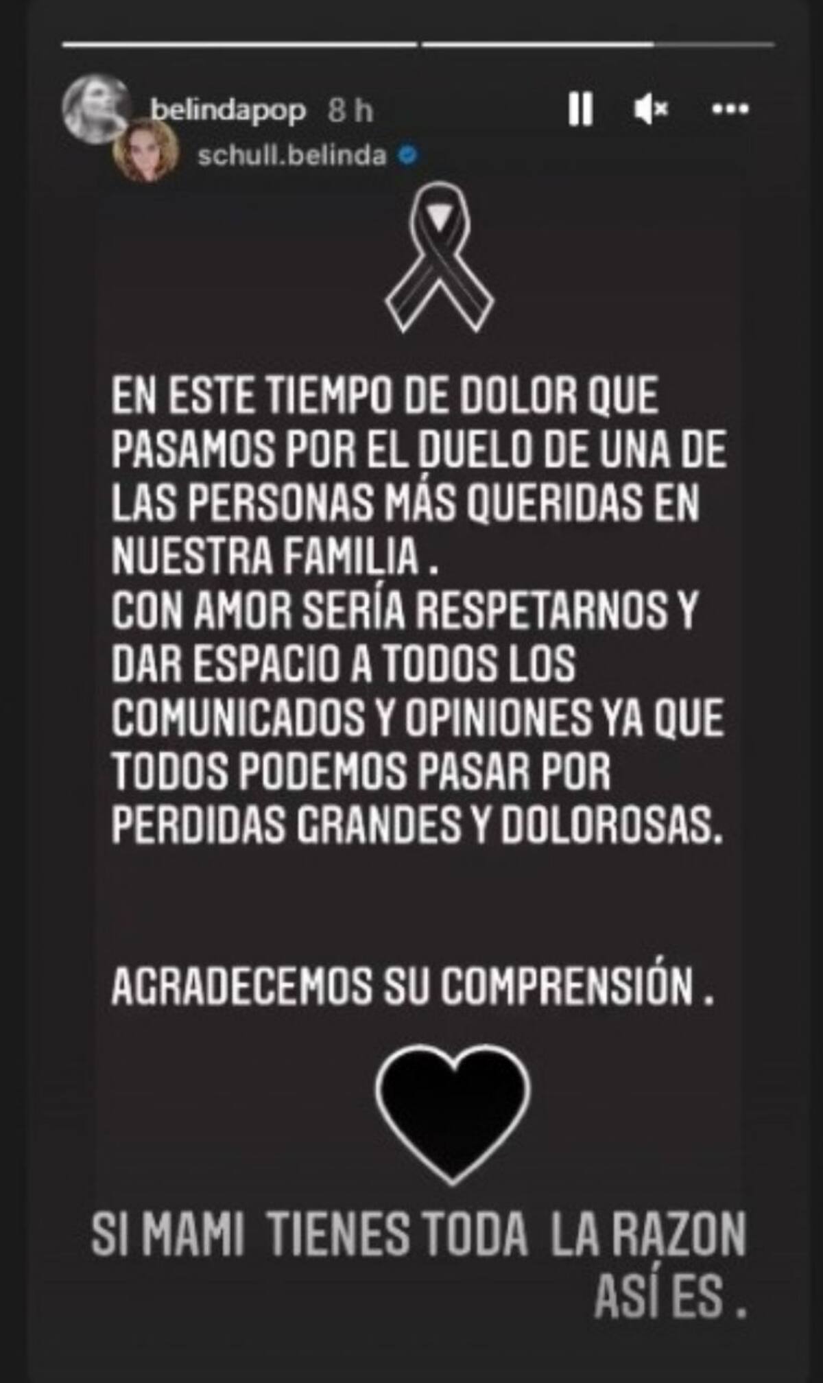 “En este tiempo de dolor que pasamos por el duelo de una de las personas más queridas de nuestra familia. Con amor sería respetarnos y dar espacio a todos los comunicados y opiniones ya que todos podemos pasar por pérdidas grandes y dolorosas”, escribió Belinda Schull, mamá de la cantante, quien compartió este escrito en Instagram. “Sí mami, tienes toda la razón, así es”, mencionó la también empresaria al compartir lo dicho por su progenitora.