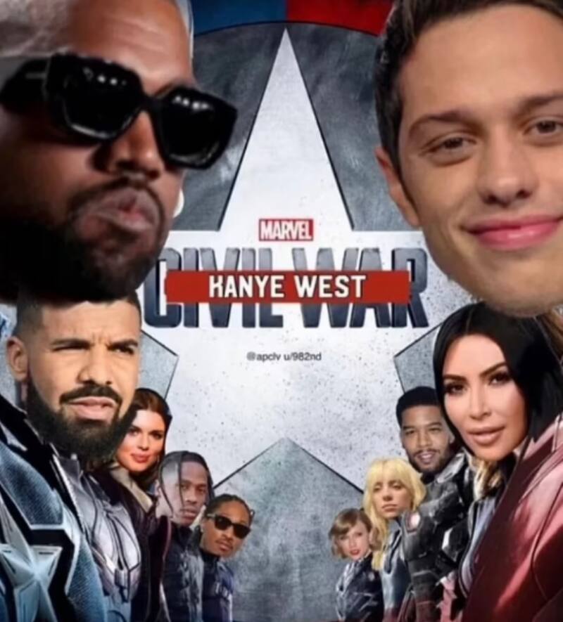 Kanye West, de 44 años, compartió en su cuenta de Instagram el póster de la película de Capitán América: Civil War, pero en lugar de estar los actores principales del filme, se mostró la cara de distintas celebridades, entre ellas el propio West por un lado con Drake, Julia Fox y Travis Scott. Al otro lado, como si estuvieran en su contra, Pete Davidson junto a Kim Kardashian, Billie Eilish, y Kid Cudi.