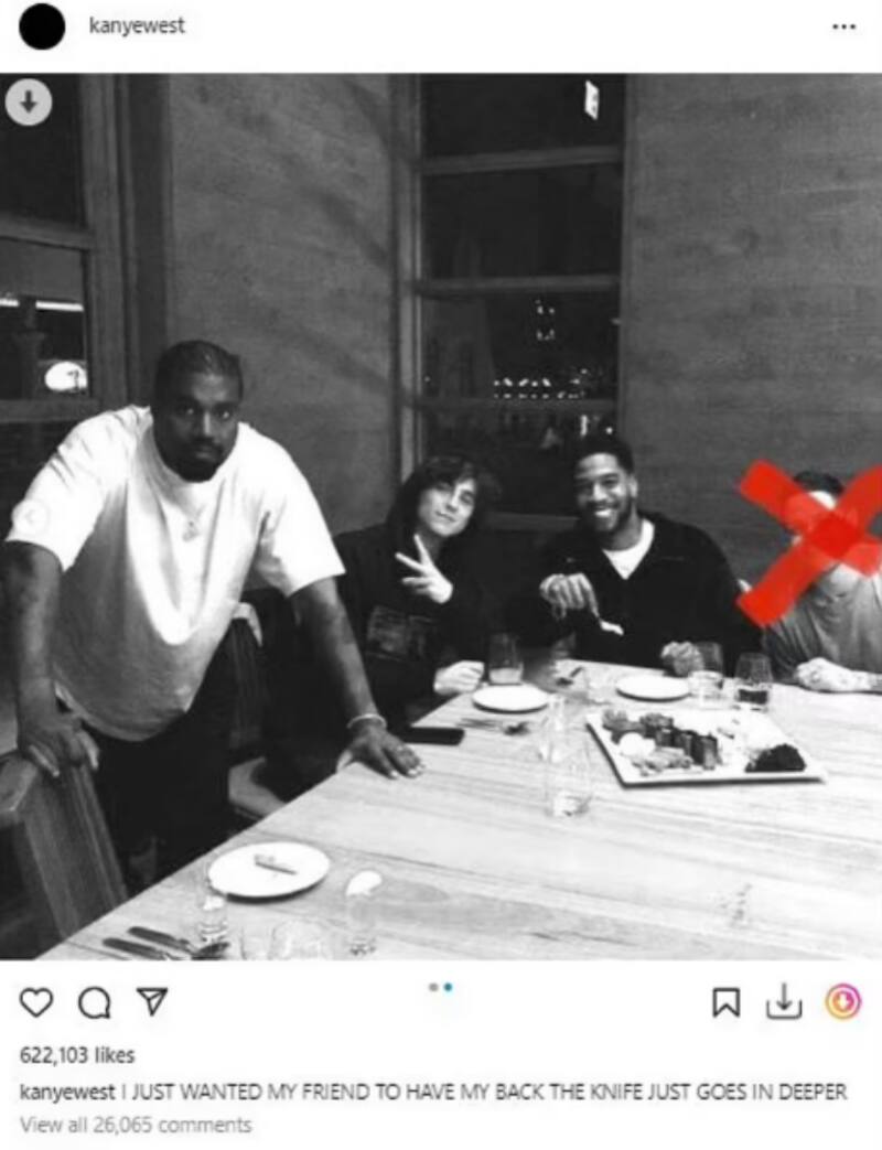 “Sólo quería que mi amigo me respaldara. El cuchillo se hunde más profundo”, subtituló en una foto en blanco y negro de una cena en Nobu Malibu con Kid Cudi y Davidson, cuya cara estaba tachada en rojo. La noche en la fotografía tuvo lugar en 2019 y también incluyó a Kim Kardashian y al nominado al Oscar, Timothée Chalamet.