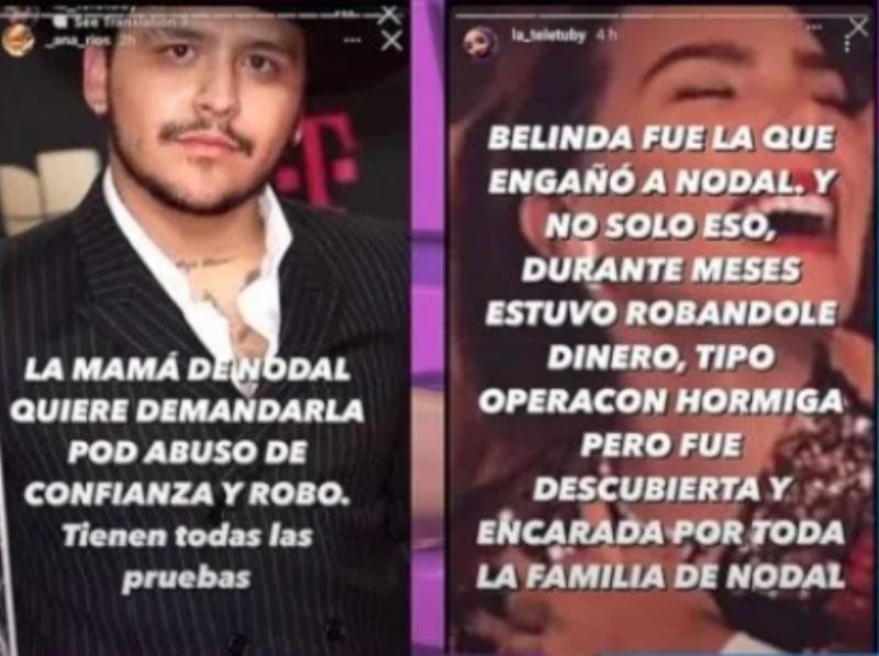 También se dice que descubrieron que la actriz le enviaba mensajes a un exnovio a quien también le pedía dinero: "Belinda fue la que engañó a Nodal y no sólo eso, durante meses estuvo robándole dinero, tipo operación hormiga, pero fue encarada por toda la familia de Nodal", afirmaba la cuenta que hasta el momento continúa siendo privada.