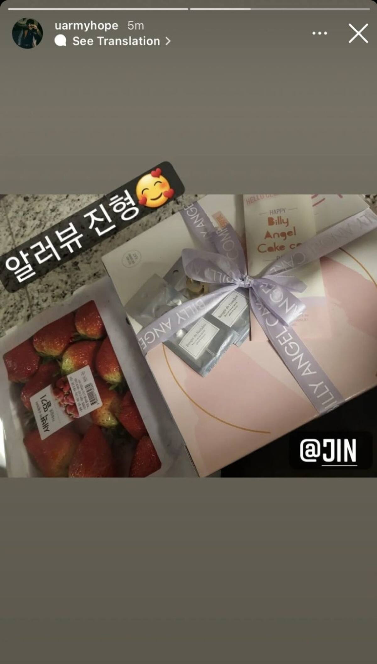 J-hope mostró en sus historias de Instagram el obsequio que su amigo le dio: una caja que aparentemente tenía un pastel y una caja de fresas y le expresó su agradecimiento con una frase muy amorosa: "Te amo, Jin hyung".
