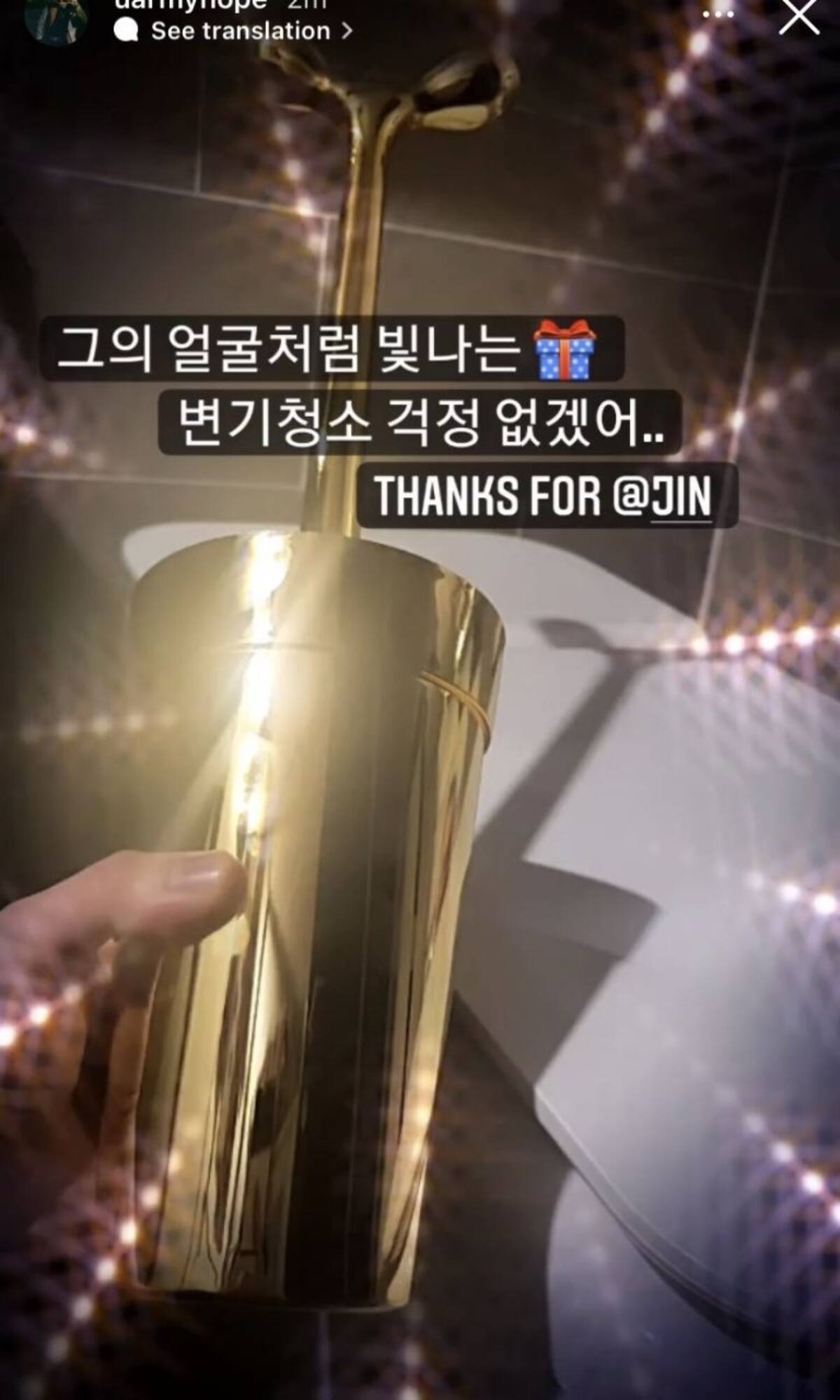 Pero fue el último regalo que presumió que causó la sorpresa de todos, pues le dio ni más ni menos que un cepillo de oro para ¡limpiar el excusado! en tono de broma Hobi escribió: "Un regalo que brilla como su rostro. Ahora no tendré que preocuparme en limpiar el baño".