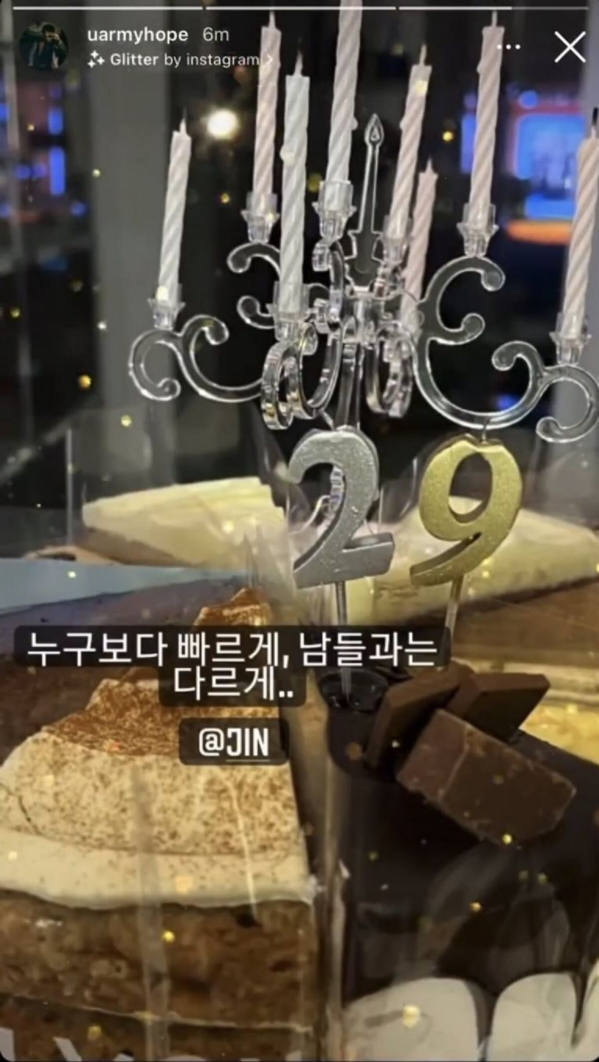 Más tarde, mostró en su cuenta personal el pastel que le dio su compañero, con trozos de chocolate, un candelabro con velas y el número 29 con el texto: "Más rápido que todos, diferente a los demás", refiriéndose a que Jin fue el primero en felicitarlo.