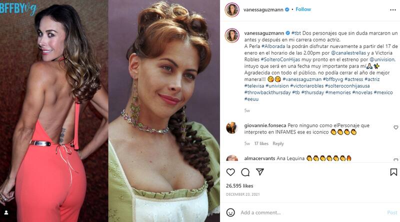 Vanessa Guzmán es una actriz mexicana con una amplia trayectoria en televisión, se le recuerda por sus personajes de villana en telenovelas como Infames, producida por Argos en 2012, y Amar otra vez, donde dio vida a la malvada Verónica Santillán. Próximamente se le volverá a ver en la pantalla chica con el reestreno de Soltera con hijas, en Univisión, proyecto que fue estrenado en México en 2019