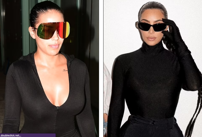 La influencer de 24 lució un jumpsuit negro ceñido y pronunciado, así como unos lentes oscuros enormes, look que ya se le ha visto anteriormente a la CEO de Skims.
