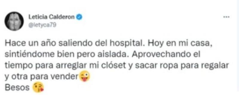 “Hace un año saliendo del hospital. Hoy en mi casa, sintiéndome bien pero aislada. Aprovechando el tiempo para arreglar mi clóset y sacar ropa para regalar y otra para vender. Besos”, escribió en su cuenta de Twitter. En el posteo recibió muestras de afecto y algunos famosos enviaron sus mejores deseos.