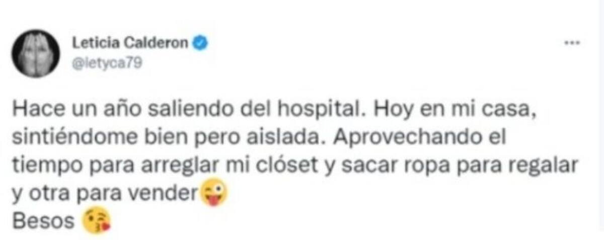 “Hace un año saliendo del hospital. Hoy en mi casa, sintiéndome bien pero aislada. Aprovechando el tiempo para arreglar mi clóset y sacar ropa para regalar y otra para vender. Besos”, escribió en su cuenta de Twitter. En el posteo recibió muestras de afecto y algunos famosos enviaron sus mejores deseos.