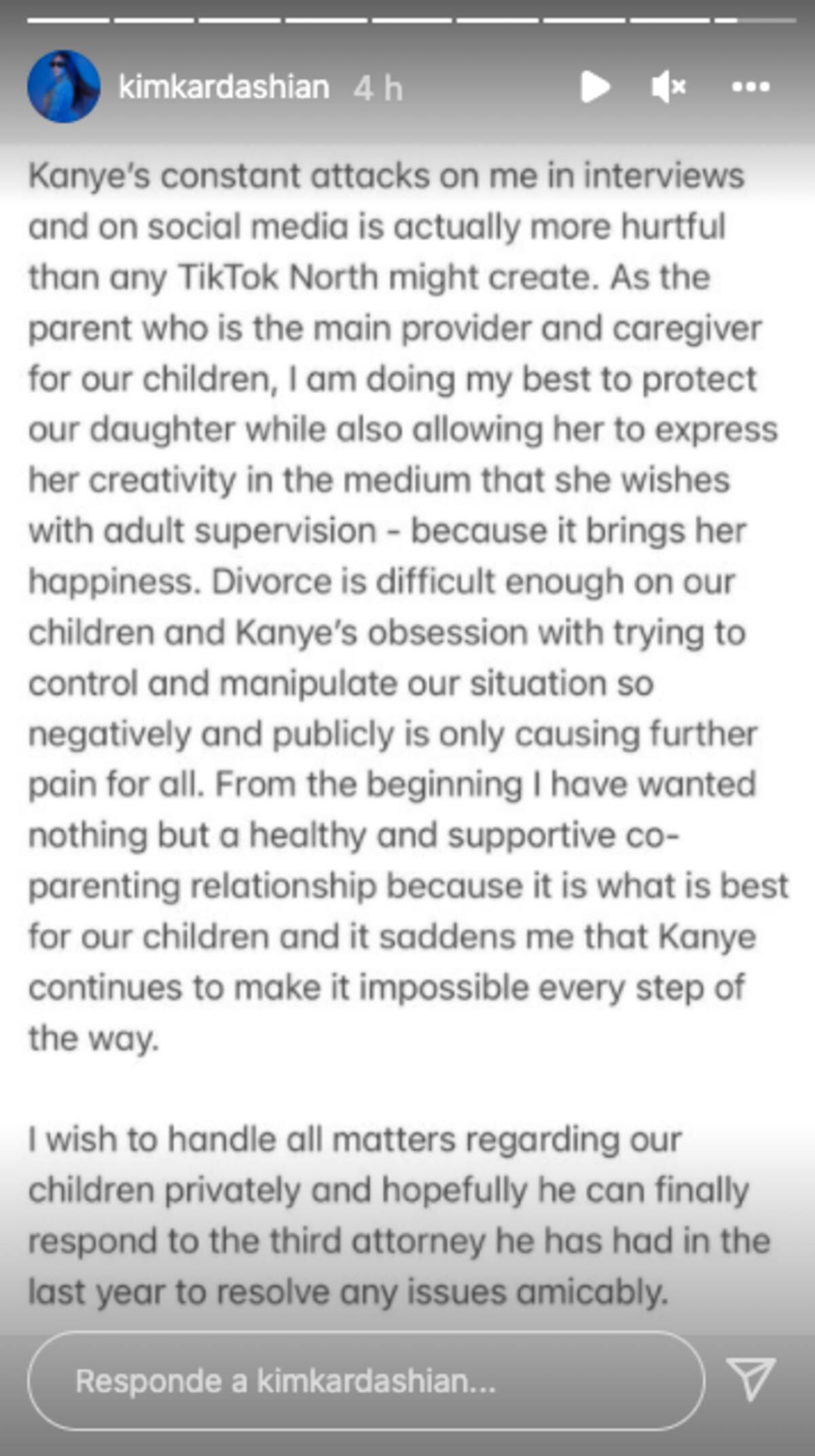 Por último, Kim Kardashian aseguró que ella ha procurado tener una relación cordial con su ex esposo, por el contrario, él lo ha complicado todo: "Me entristece que Kanye siga haciéndolo imposible a cada paso. Deseo manejar todos los asuntos relacionados con nuestros hijos de forma privada y espero que él pueda finalmente responder al tercer abogado que ha tenido en este último año para resolver cualquier asunto de forma amistosa".