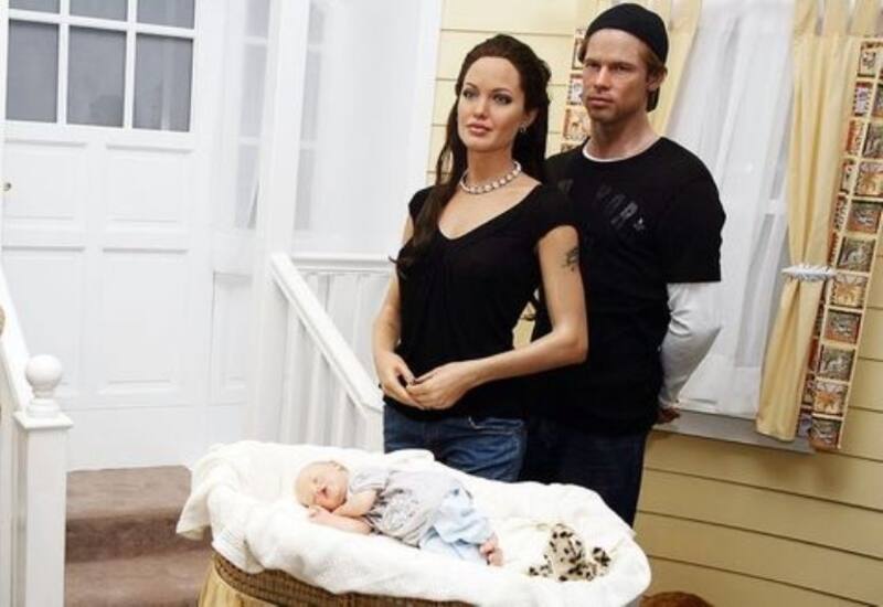 La figura de cera de Shiloh está acostada en un moisés tejido al lado de la figura de sus padres, Angelina Jolie y Brad Pitt.