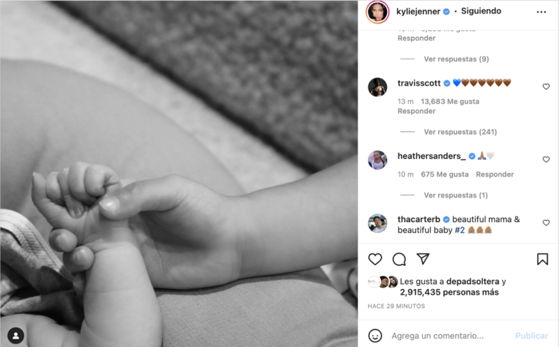 "Mami de dos vidas", comentó en la fotografía en blanco y negro su hermana Kourtney Kardashian; mientras que su mamá, Kris Jenner se limitó a escribir "Angel pie". Travis Scott, el papá de los dos hijos de Kylie posteó varios corazones color café en la instantánea.