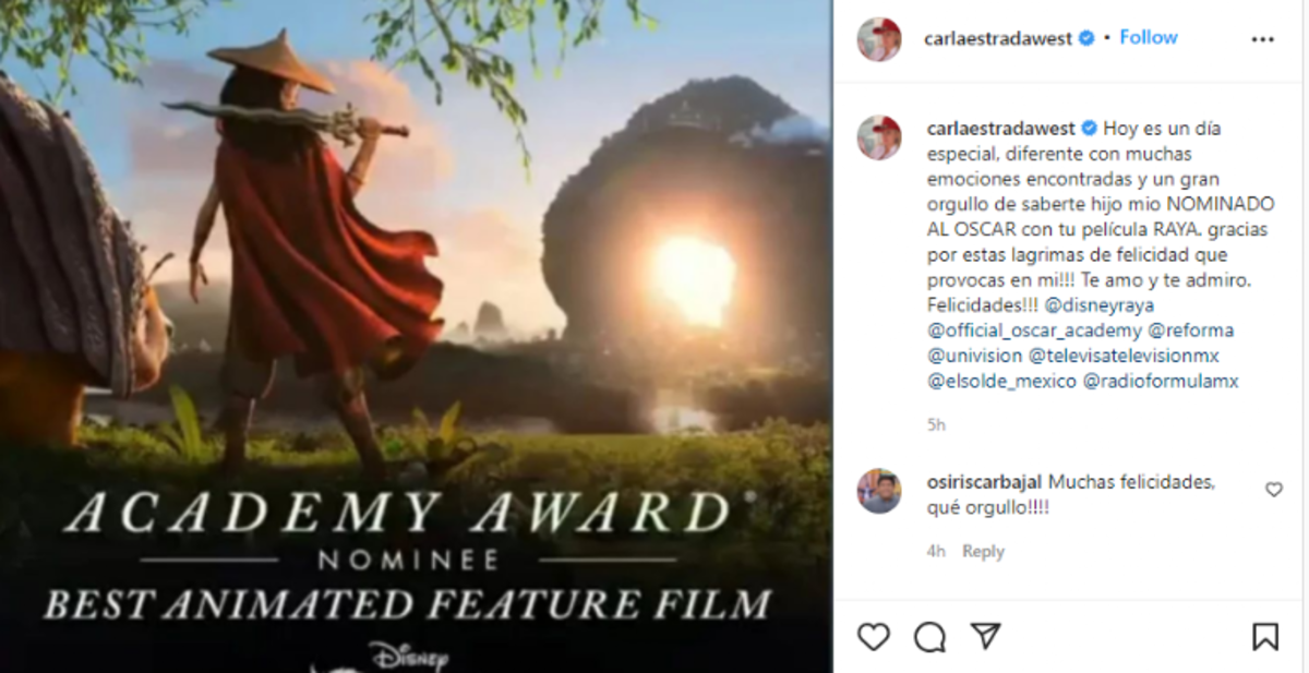 "Hoy es un día especial, diferente con muchas emociones encontradas y un gran orgullo de saberte, hijo mío, NOMINADO AL OSCAR con tu película RAYA. ¡Gracias por estas lagrimas de felicidad que provocas en mí! Te amo y te admiro. ¡Felicidades!”, escribió en su cuenta de Instagram.