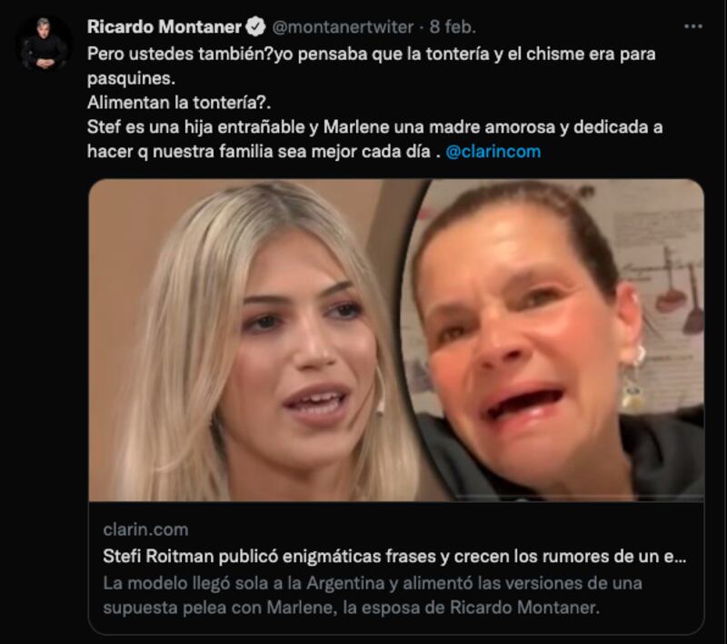 "¿Pero ustedes también? Yo pensaba que la tontería y el chisme eran para pasquines ¿Alimentan la tontería? Stef es una hija entrañable y Marlene una madre amorosa y dedicada a hacer que nuestra familia sea mejor cada día", escribió el cantante visiblemente molesto.