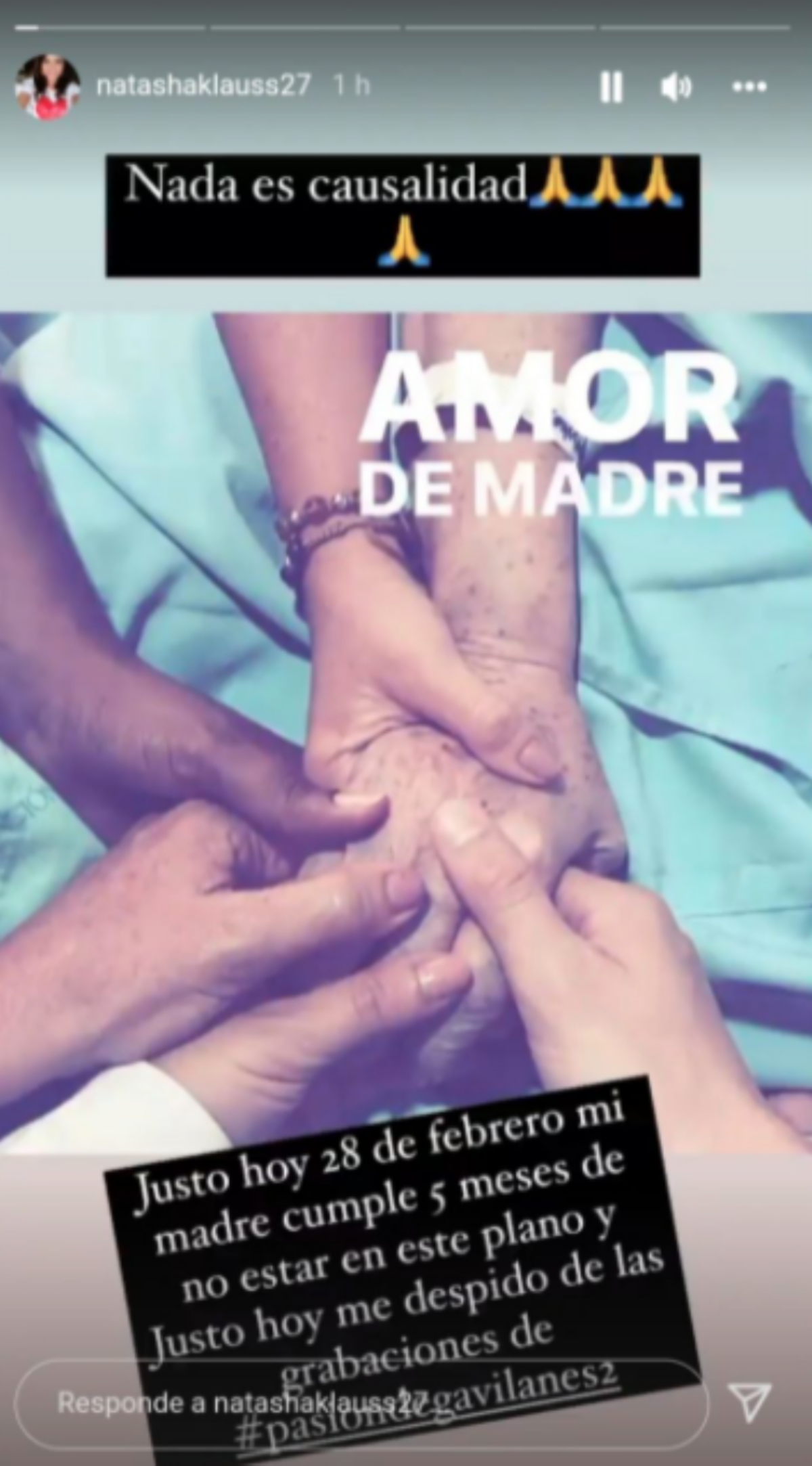 La actriz que interpreta a Sara Elizondo publicó en sus historias de Instagram una foto sosteniendo la mano de su mamá: “Nada es casualidad. Justo hoy 28 de febrero mi madre cumple cinco meses de no estar en este plano y justo hoy me despido de las grabaciones de #pasiondegavilanes2”.