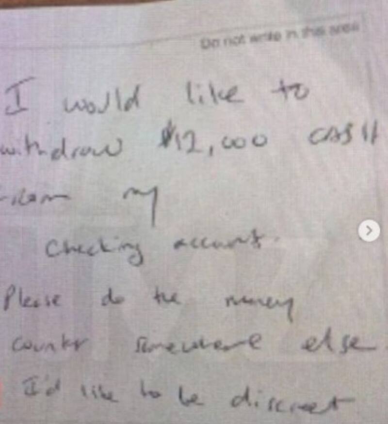 Ryan llegó al lugar con lentes oscuros, una gorra y su cubre bocas, a la cajera le entregó un comprobante para retirar el dinero pero en la parte de atrás le escribió una nota. “Quisiera retirar 12 mil dólares en efectivo de mi cuenta. ¿Por favor podría contar el dinero en otro lado? quiero ser discreto”, mencionó.