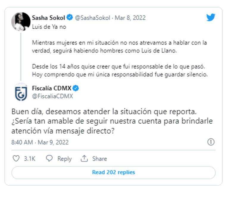 A partir de ahí se desató la polémica, pues al poco tiempo la cantante también apareció en redes sociales para contar su versión, lo cual volvió aún más delicado el asunto, pues la ex integrante de Timbiriche, a través de su cuenta de Twitter acusó a De Llano de abuso, lo cual atrajo la atención de la Fiscalía de la Ciudad de México, que pidió a la artista ponerse de inmediato en contacto para dar seguimiento el caso.
