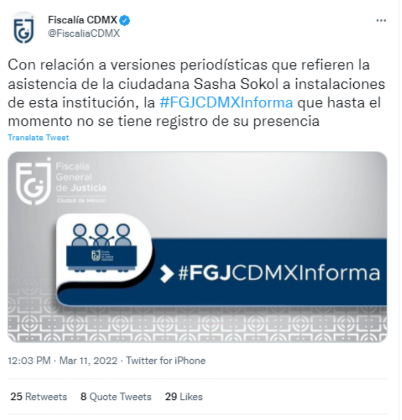 “Con relación a versiones periodísticas que refieren la asistencia de la ciudadana Sasha Sokol a instalaciones de esta institución, la Fiscalía General de Justicia de la Ciudad de México informa que hasta el momento no se tiene registro de su presencia”, se lee en el tuit publicado al mediodía de este viernes 11 de marzo.