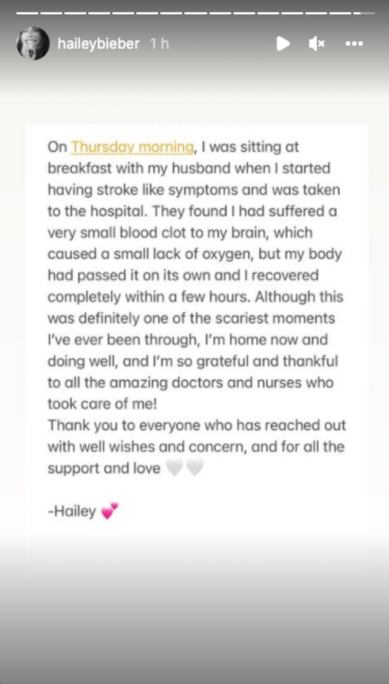 Por último, Hailey aseguró que vivió momentos muy angustiantes y agradeció a todo el equipo médico que la atendió: "Aunque este fue definitivamente uno de los momentos más aterradores por los que he pasado, ahora estoy en casa y me va bien, y estoy muy agradecida con todos los increíbles médicos y enfermeras que me cuidaron.Gracias a todos los que se han acercado con buenos deseos y preocupación, y por todo el apoyo y amor'.