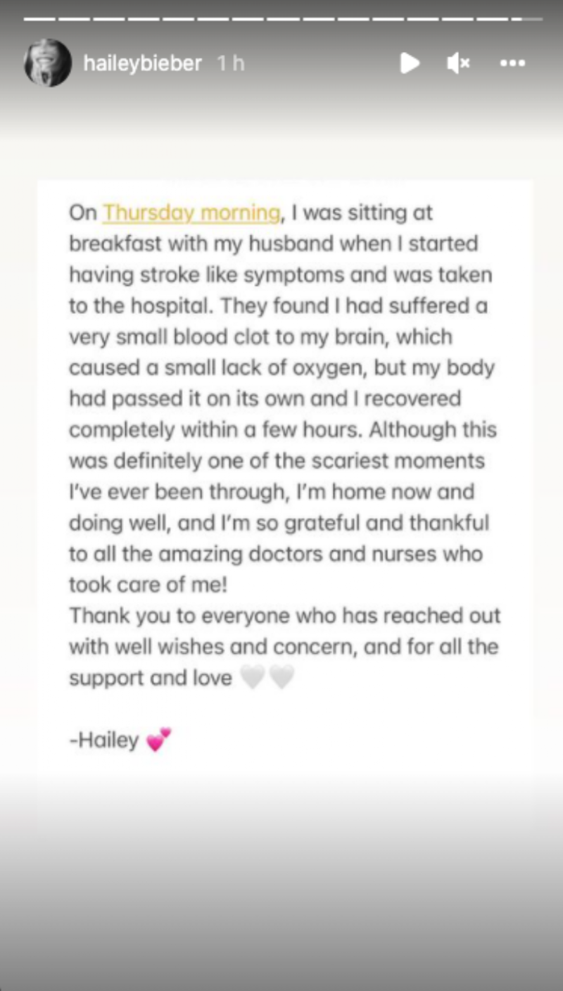 Por último, Hailey aseguró que vivió momentos muy angustiantes y agradeció a todo el equipo médico que la atendió: "Aunque este fue definitivamente uno de los momentos más aterradores por los que he pasado, ahora estoy en casa y me va bien, y estoy muy agradecida con todos los increíbles médicos y enfermeras que me cuidaron.Gracias a todos los que se han acercado con buenos deseos y preocupación, y por todo el apoyo y amor'.