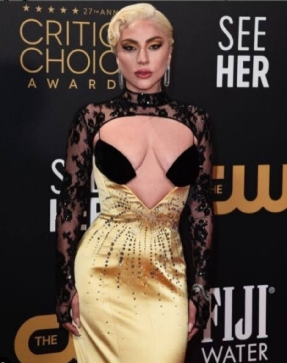 En redes sociales sorprendió que por la tarde la cantante apareció en la alfombra roja de los BAFTA con un look muy sofisticado en color negro portando joyería Tiffany pero en la noche lució completamente diferente con un vestido amarillo y peinado diferente presentándose en el desfile de estrellas de los Critics Choice lo que casó controversia.