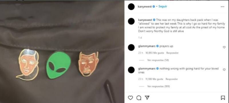 “Esto estaba en la mochila de mi hija cuando tuve 'permitido' verla la semana pasada. Es por esto que lucho tanto por mi familia. Estoy dispuesto a proteger a mi familia a toda costa , como el sacerdote de mi casa. No te preocupes Northy, Dios sigue aquí”, mencionó el cantante en su cuenta de Instagram, lo anterior hace alusión a tres pines que tenía North en su mochila, uno con la cara de Kim, otro con la de su padre y el tercero era un alien, según Ye éste último hace alusión a Pete pues su hija no está de acuerdo con la relación de su mamá.