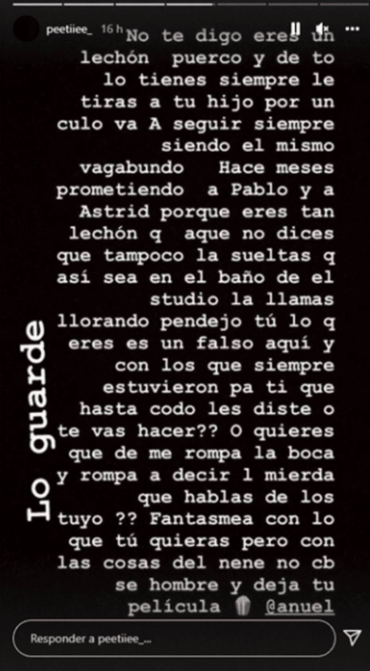 "Eres un puer$%, tú y toda tu familia. No tienes moral y mucho menos vergüenza. No eres hombre y mucho menos padre. Recuerda que todo lo que sube, así mismo baja. Los sacaste a la calle. No te preocupes, que sola ella no está. Miserable, poco hombre. Todo lo malo lo tienes", fue uno de los mensajes que escribió Nicole Cueva.