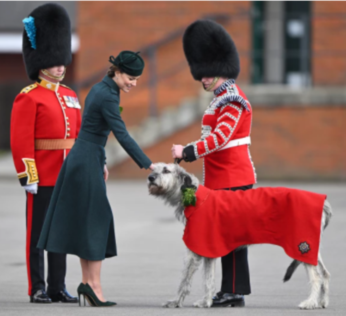Durante este acto militar se le vio muy cariñosa y entusiasmada con Turlough Mor, a quien de carillo le llaman Domhnall, un lobero irlandés, mascota del regimiento, a quien también le colocó un ramo de trébol.