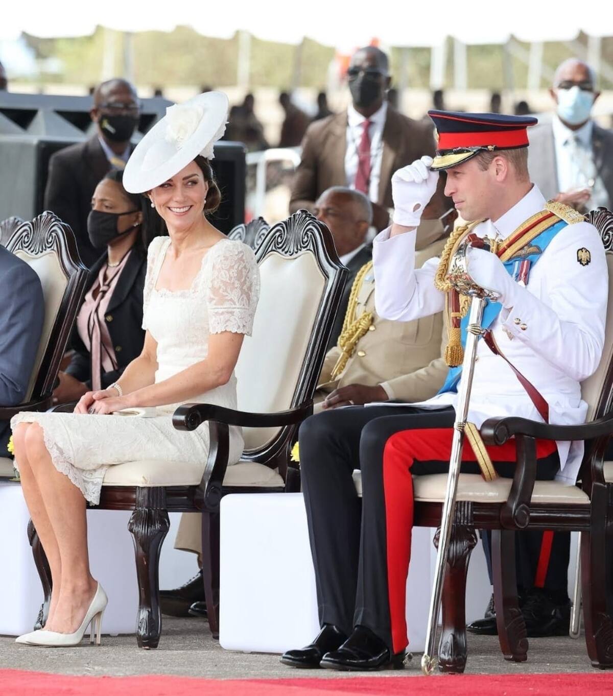 Los duques de Cambridge visitaron al personal de servicio del Caribe que acaba de terminar su programa de entrenamiento en la Carribean Military Academy, por lo que el príncipe lució uno de sus uniformes militares conocido como el Tropical Dress de los Blues and Royals.