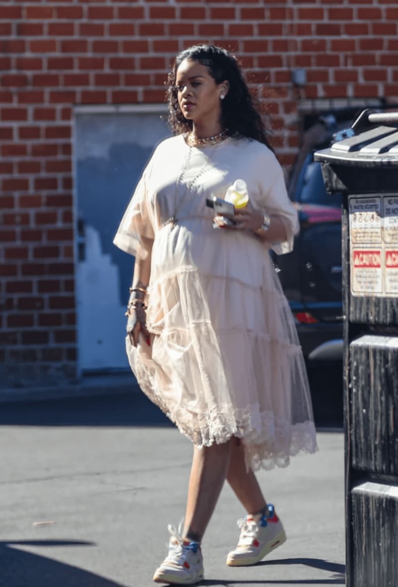 Para poder estar cómoda durante la última recta de su estado de gestación, Riri combinó su atuendo con unos exclusivos tenis Air Jordan 4 SP Guava Ice de Jordan x Union, además uso una bolsa Gucci y joyas de Briony Raymond, Bvlgari, Lang Antiques y Patcharavipa.
