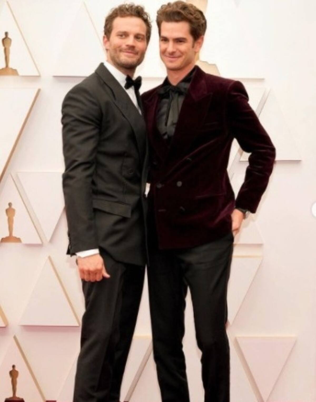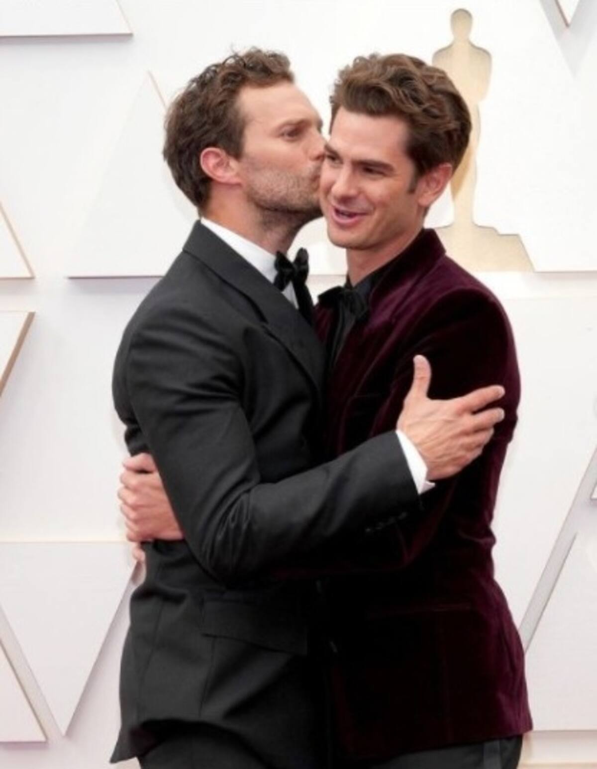 Andrew se encontraba posando ante las cámaras cuando Jamie se acercó a fotografiarse con él, ambos se abrazaron y Dornan le dio un beso en la mejilla al nominado al Oscar. En redes sociales se han hecho virales las fotos de los actores además de esta muestra de afecto que protagonizaron, la cual se hizo recurrente en la alfombra roja pues Kourtney Kardashian y Travis Barker hicieron lo mismo.