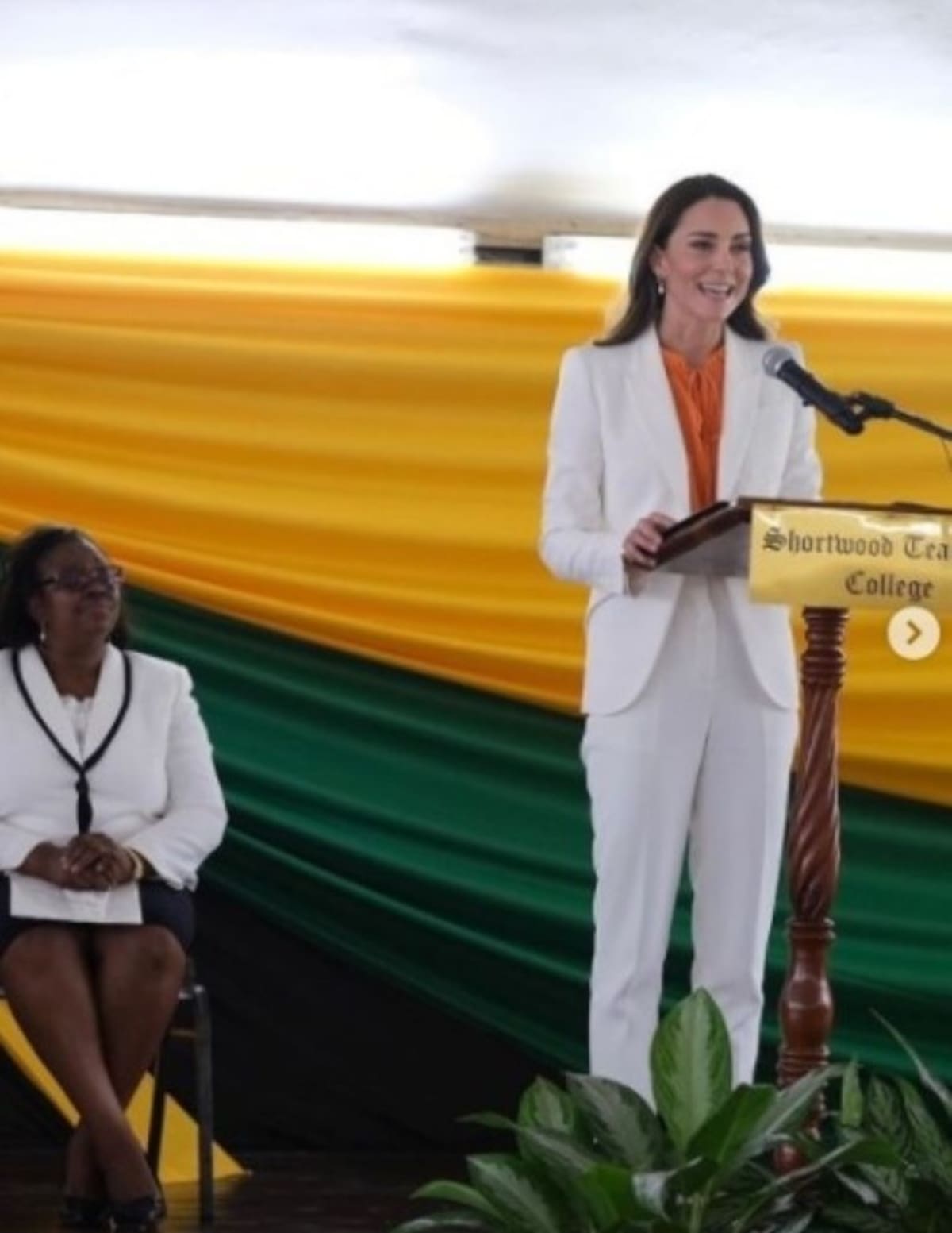Los diseños de Alexander McQueen no faltaron en las prendas que usa la duquesa Cambridge, incluso para las fotos oficiales con motivo de su cumpleaños, también mantuvo presentes estos diseños del fallecido creador. Para la reunión con el primer ministro de Jamaica lució un traje blanco que acompañó con una camisa de seda naranja, el conjunto con un precio de mil 945 euros.