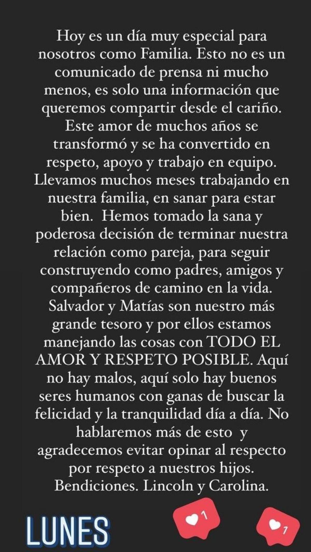 Tras 10 años de matrimonio y dos hijos, la pareja tomó la decisión de tomar caminos diferentes, así lo dio a conocer Carolina. “Hoy es un día especial para nosotros como familia. Esto no es un comunicado de prensa ni mucho menos, es sólo una información que queremos compartir desde el cariño. Este amor de muchos años se transformó y se ha convertido en respeto, apoyo y trabajo en equipo”, escribió Palomeque.