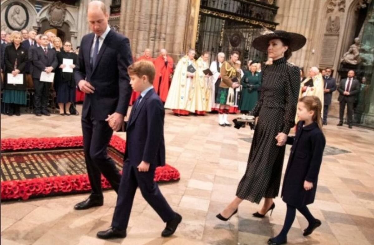 Los duques de Cambridge asistieron a la ceremonia acompañados de sus dos hijos mayores, la princesa Charlotte y Jorge de Cambridge. Como era de esperarse, Kate deslumbró por su atuendo portando un vestido de cuello alto en color negro con lunares blancos.