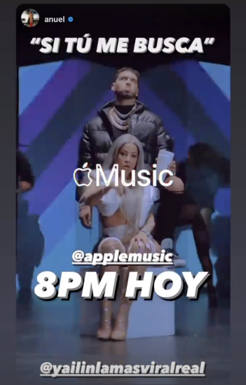Le siguieron dos historias más con fragmentos del videoclip que se estrenará a las 8 de la noche en la que se ve al artista junto a Yailin: “MÚSICA PARA ADULTOS!!!!!!! MÚSICA DE CALLE!!!!!!! ???????? #SiTuMeBusca - @yailinlamasviralreal HOY A LAS 8PM!!!!!!!”