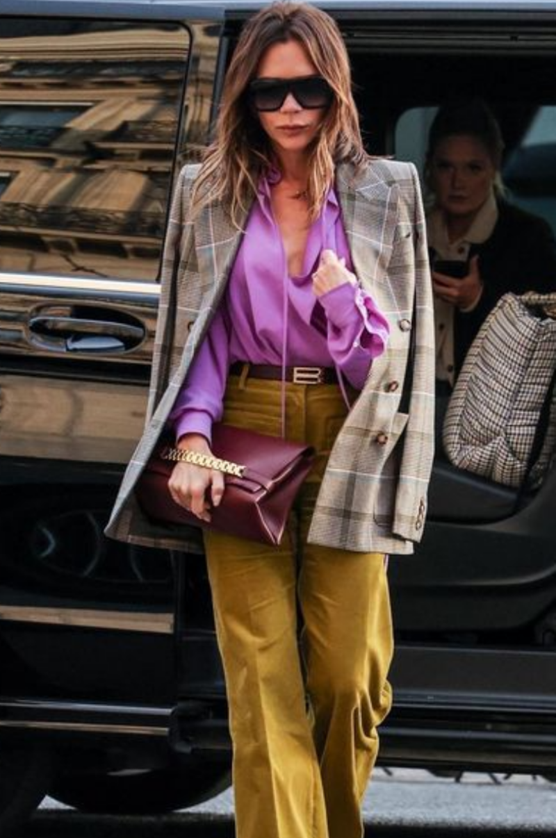 El look que Victoria usó esta vez constó de una blusa lila desabrochada, un pantalón de pana mostaza de talle alto, un blazer de tweed de lana a cuadros grises con doble botonadura, unos botines estilo Chelsea de cuero con tacón negro y unas gafas de sol de montura cuadrada.