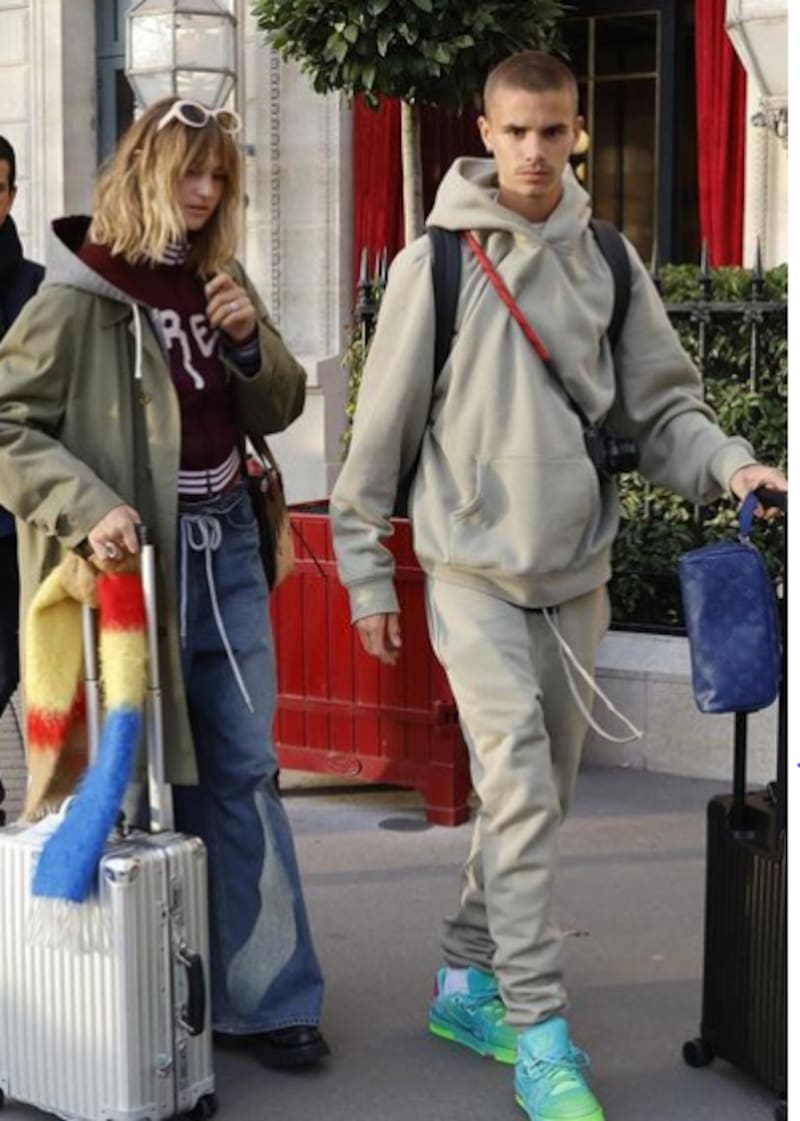 El hijo de David Beckham se vistió con un pantalón deportivo con sudadera gris y para rematar usó unos coloridos tenis fluorescentes verde con azul; su novia, la influencer y modelo lució un pantalón de mezclilla de pierna ancha, una sudadera guinda con una gabardina en tono caqui.
