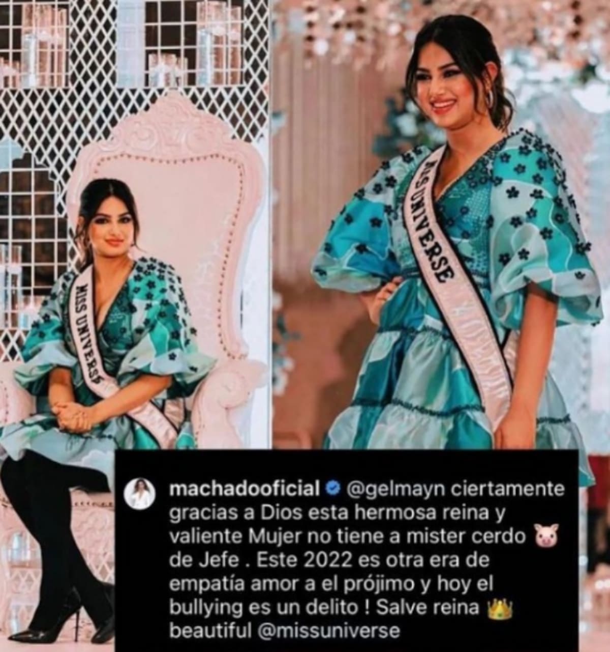 Machado fue tajante en su mensaje alegando: “Gracias a Dios esta hermosa reina y valiente Mujer no tiene a mister cerdo de jefe. ¡Este 2022 es otra era de empatía, amor al prójimo y hoy el bullying es un delito! Salve reina beautiful”, comentó la ganadora de la Casa de los famosos haciendo alusión al ex presidente Trump, que hasta 2021 fue accionista del certamen de belleza Miss Universo.