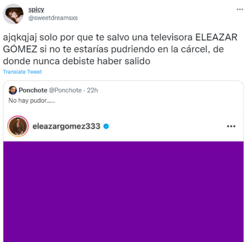 “Solo por que te salvo una televisora ELEAZAR GÓMEZ si no te estarías pudriendo en la cárcel, de donde nunca debiste haber salido”, “Que hacia Eleazar Gómez hablando del 8 de marzo? Ese cabr#$ debería estar preso; con que cara pone algo, cuando tiene varias denuncias sobre violencia y hasta estuvo detenido”, son algunos de los comentarios que se ven en twitter.