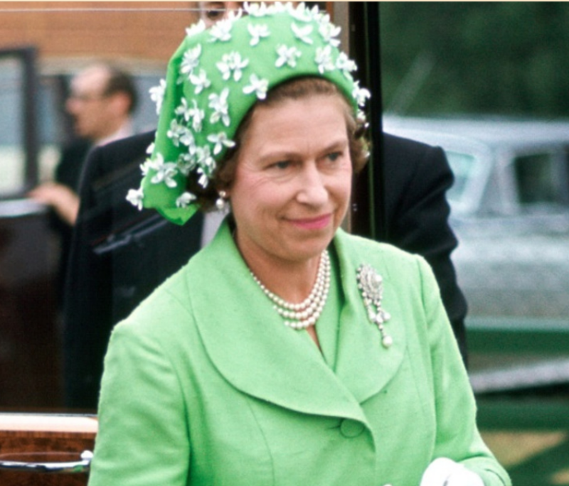 En 1973, Su Majestad Real acudió a la carrera de caballos de Royal Ascot con un tocado de seda color menta con detalles de cinta blanca.