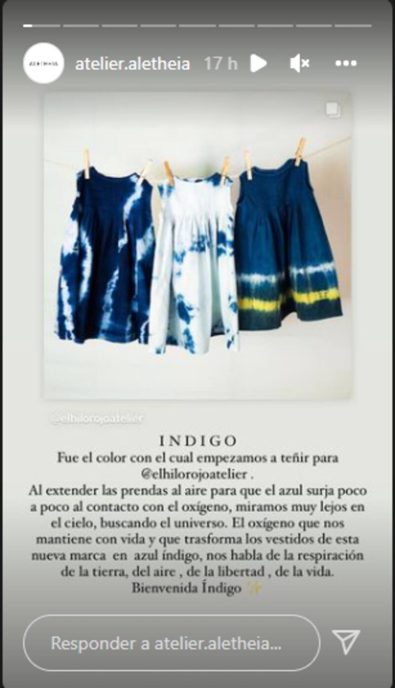 "El oxígeno que nos mantiene con vida y que transforma los vestidos de esta nueva marca en azul índigo, nos habla de la respiración de la tierra, del aire, de la libertad, de la vida. Bienvenida Índigo", dice una breve reseña sobre la línea de ropa. La colección incluye varias prendas, entre ellas vestidos, pantalones en colores azul y blanco.