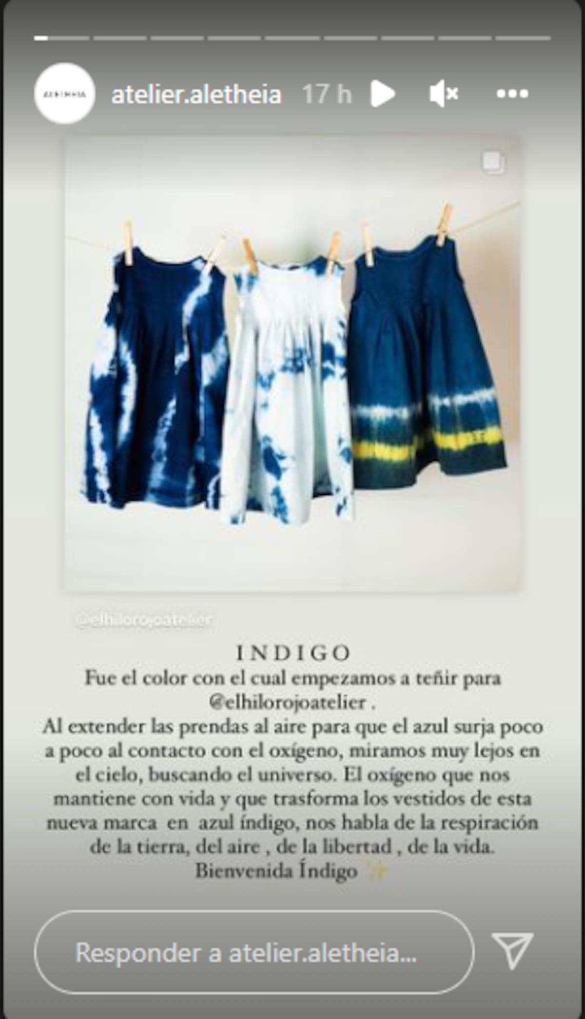 "Índigo fue el color con el cual empezamos a teñir para El Hilo Rojo. Al extender las prendas al aire para que el azul surja poco a poco al contacto con el oxígeno, miramos muy lejos en el cielo, buscando el universo.