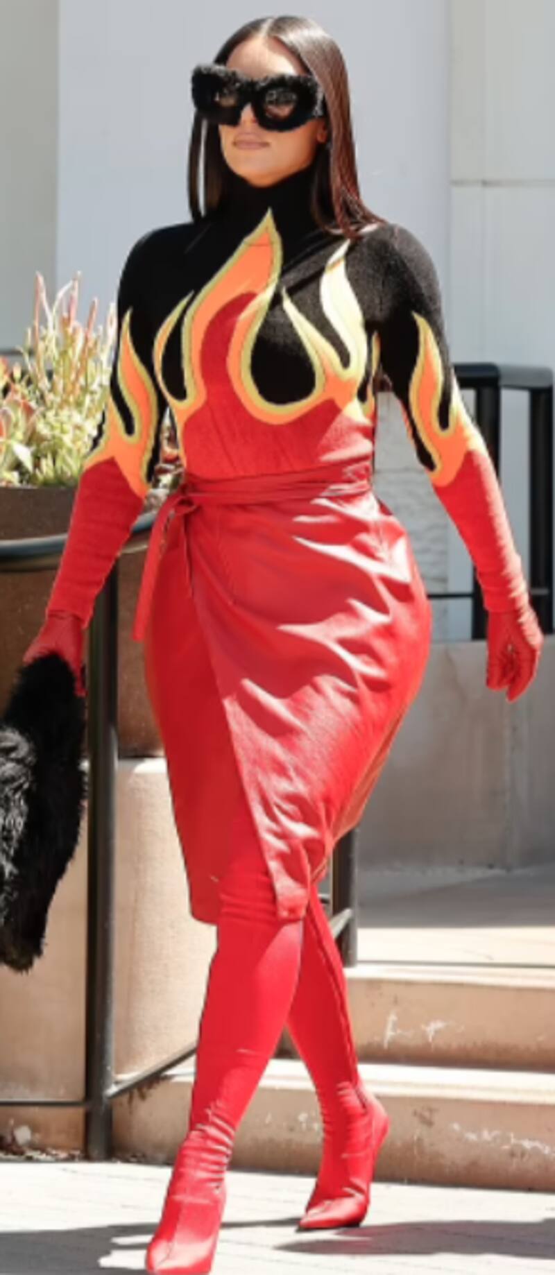 La novia de Pete Davidson fue vista saliendo de un restaurante en Woodland Hills, California, enfundada en sus ya conocidos enterizos (un traje completo que incluyen zapatos, pantalones y la parte superior cubriendo todo el brazo hasta los dedos de la mano, simulando guantes), de la marca Balenciaga, pero esta vez con estampado de flamas que combinó con una falda de cuero roja y de accesorios usó una bolsa negra y lentes oscuros de peluche.