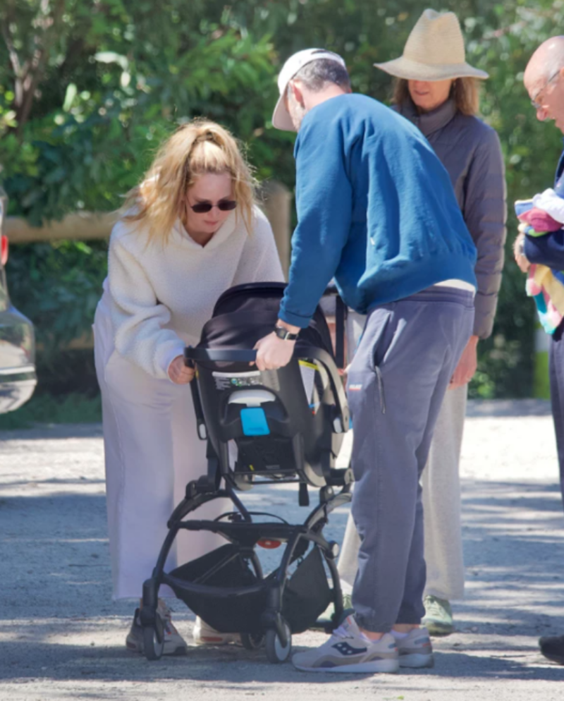 La protagonista de la saga de Los juegos del hambre salió de paseo con su esposo Cooke Maroney y otra pareja, y durante todo el tiempo estuvo pendiente de su primogénito, quien iba muy cómodo en su carriola.