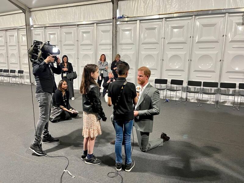 Los niños reporteros, Sophia y Jay, se acercaron a Harry para hacerle una pregunta, pero antes de que Sophia hablara el duque de Sussex se hincó para poder estar a la altura de los niños, este gesto ha conmovido a los cibernautas y las personas que estuvieron presentes quienes capturaron este momento.