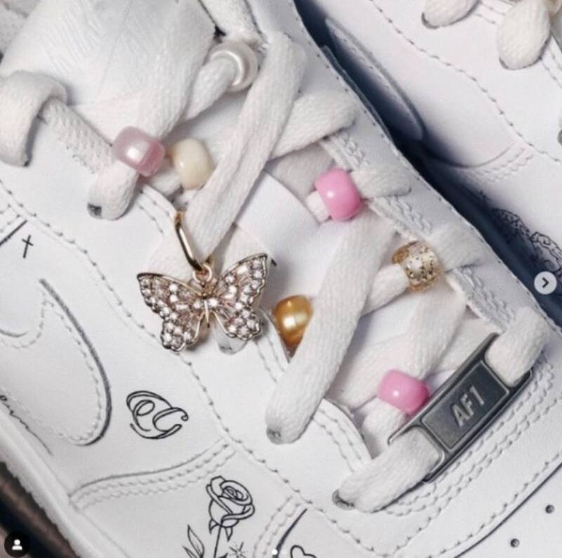 Basándose en mariposas, Adam logró capturar la esencia de la pareja con tatuajes, rosas, frases, y pequeños accesorios que le dieron un toque de elegancia pero a la vez muy a la moda. El nombre de Brooklyn está escrito en cursiva, se rodea de rosas, mariposas y una réplica del ángel que se tatuó; en las agujetas se puede notar que tiene cuencas en color rosa, beige y dorado, a cada tenis le cuelga una mariposa.