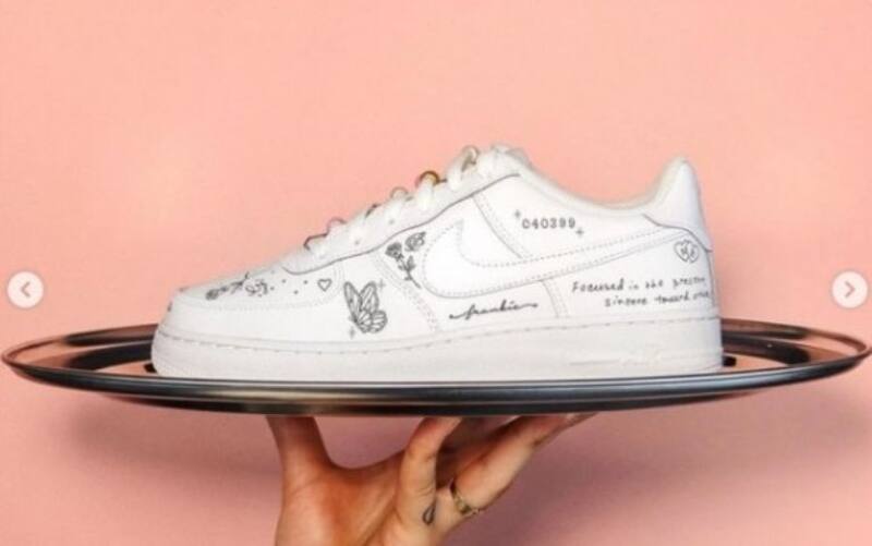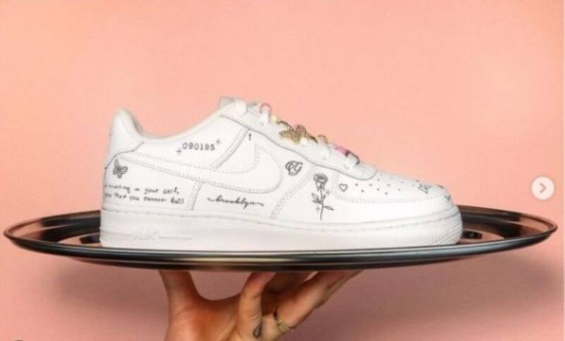 Sandra Beckham quiso tener un detalle con Nicola, pero dejó a un lado las joyas, y aquellas cosas materiales que llaman la atención al instante, así que se modernizó sin olvidar la elegancia. Sandra contactó al artista Adam Claridge quien realizó un increíble diseño sobre los tenis blancos Nike Air Force 1.