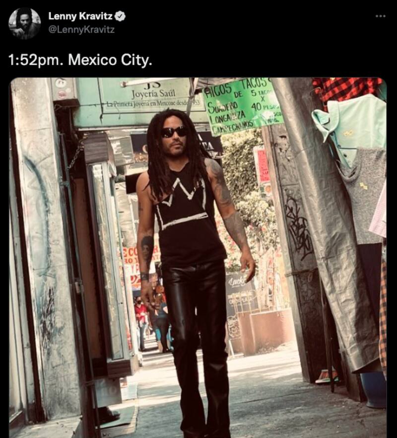 La estrella de rock Lenny Kravitz sorprendió a sus fans al dar a conocer que está de visita en la Ciudad de México, por medio de una curiosa fotografía en la que se le ve paseando entre un puesto de tacos y uno de ropa.